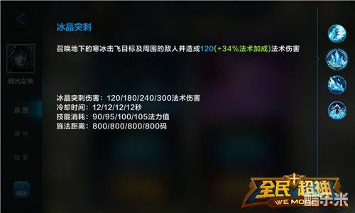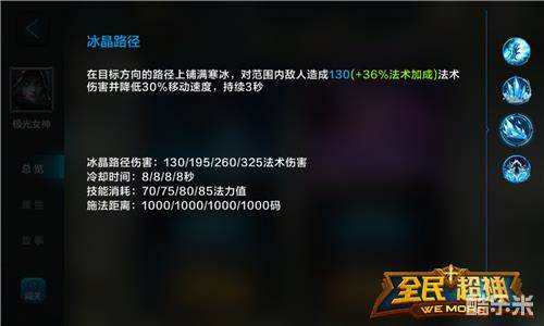 冰晶突刺将会成为一个十分强大的控制技能,冰晶路径是玩家主力输出技能,减速、伤害一样不少。极光女神在后期的技能连招可以秒杀一些脆皮甚至不是脆皮的英雄,冰晶突刺→冰封领域→冰晶路径,然后不管敌人死没死,先退后一点再说,拉开安全距离。