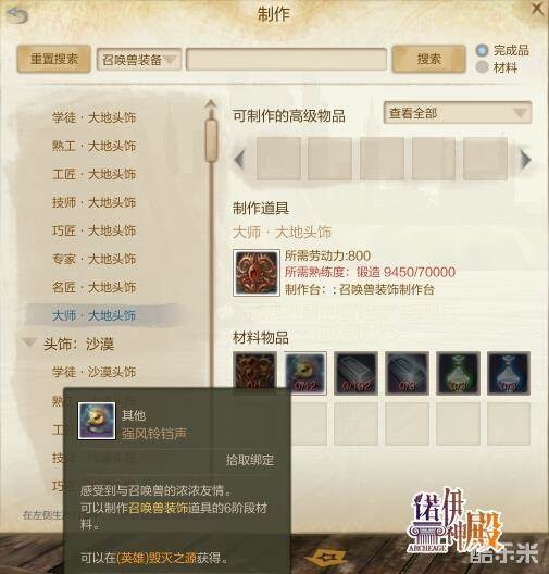 了解了需要制作什么装备,我们就要去制作了。在副本门口或城市里都会有召唤兽装饰制作台,也可以在木工制作台制作家用召唤兽装饰制作台。手工宠物装备也和人物的装备一样,分为学徒、熟工、工匠、技师、巧匠、专家、名匠、大师等几个品级,暂未开放巨匠级宠物装备。制作手工宠物装备除了和人物装备一样的那些材料外(饰品、防具源晶粉末/碎片/晶片/精华等),还需要用到击杀各个副本里的boss才能得到的“铃铛”。