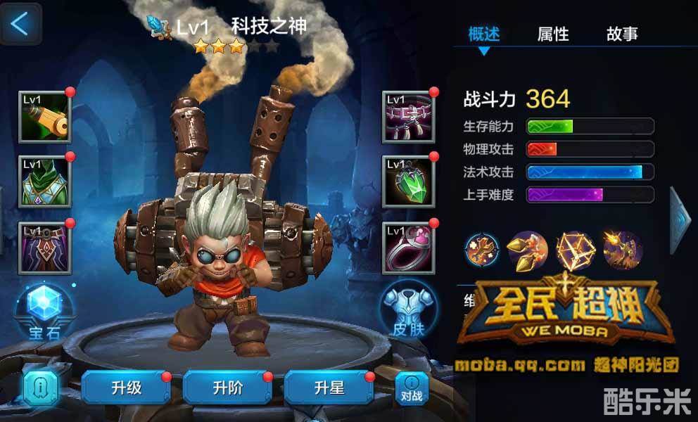 巨炮守卫(大招):召唤5支固定的巨炮来攻击周围的敌人和建筑,巨炮为建筑类型,不可被暴击,对魔法免疫,攻击时对400码范围内有20%溅射伤害,优先攻击科技之神攻击的目标,巨炮拥有400/800生命值,会对敌人造成60/100(+10%法术加成)物理伤害。