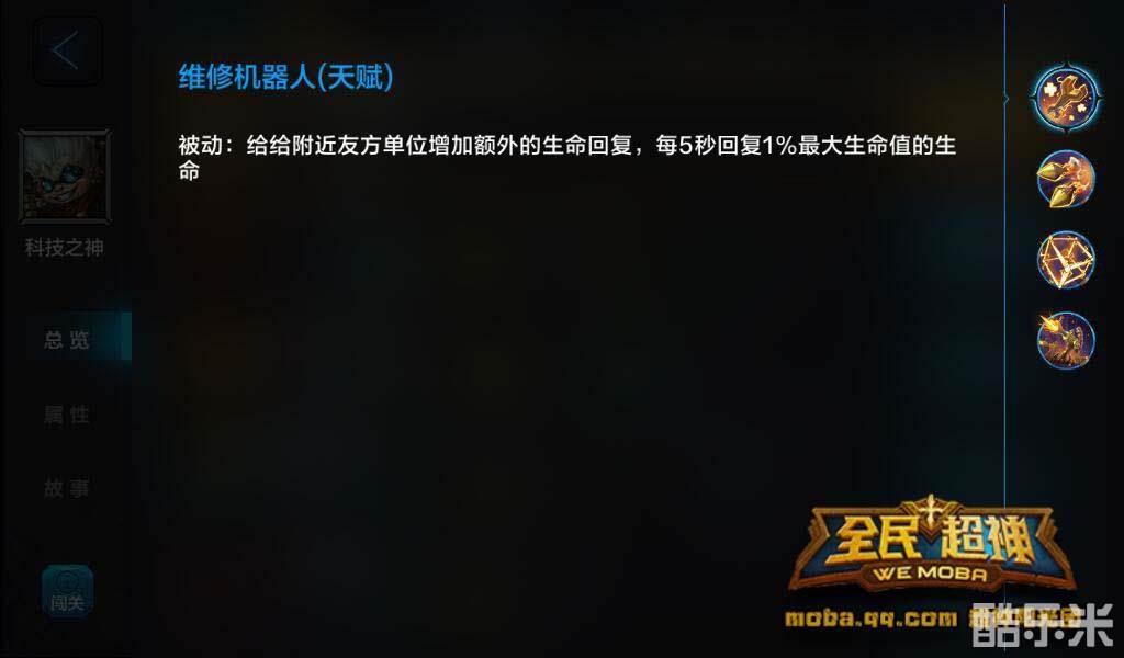 维修机器人(被动技能):给附近的炮台和友方英雄增加额外的生命回复,每5秒回复1%最大生命值。