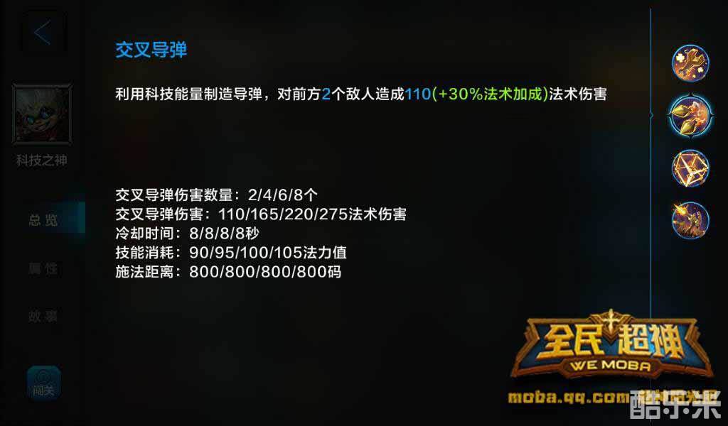交叉导弹:利用科技能量制造导弹,对前方2/4/6/8个敌人造成110/165/220/275(+30%法术加成)法术伤害。