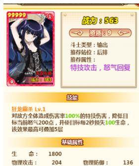 技能:狂龙霸杀,对敌方全体造成伤害率100%的特技伤害,降低目标当前怒气200点,并使目标每2秒损失100生命,效果最高可叠5层。