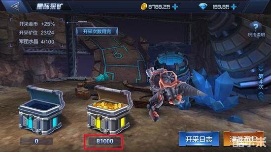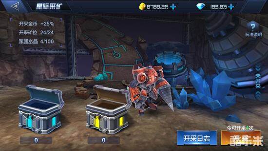 星际采矿会采出大量的金币,前期每天固定次数为4次,每个玩家每天只能开采4次金矿,获得的金币数量受到矿洞等级的影响,矿洞等级越高获得的金币数量越多。
