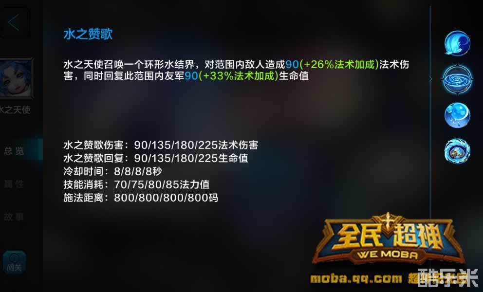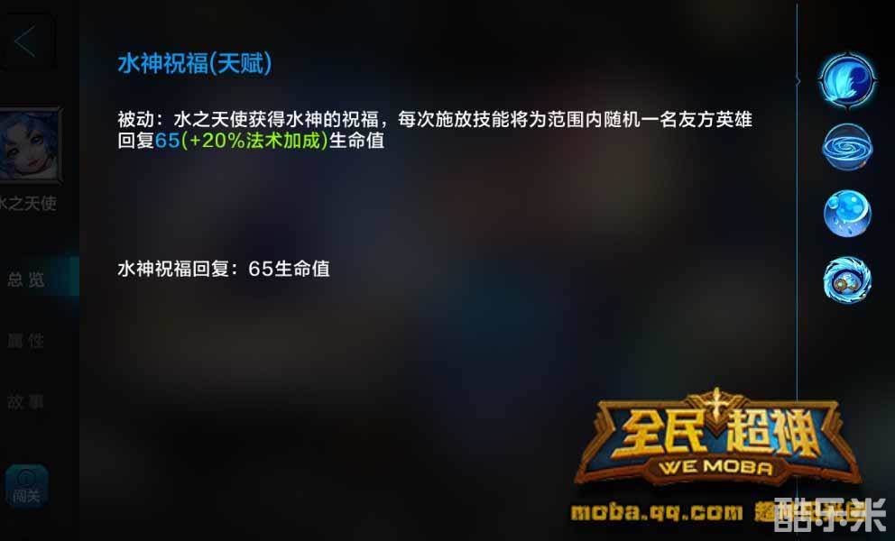 水神祝福:水之天使获得水神的祝福,每次施放技能将随机对附近一名友方英雄治疗。