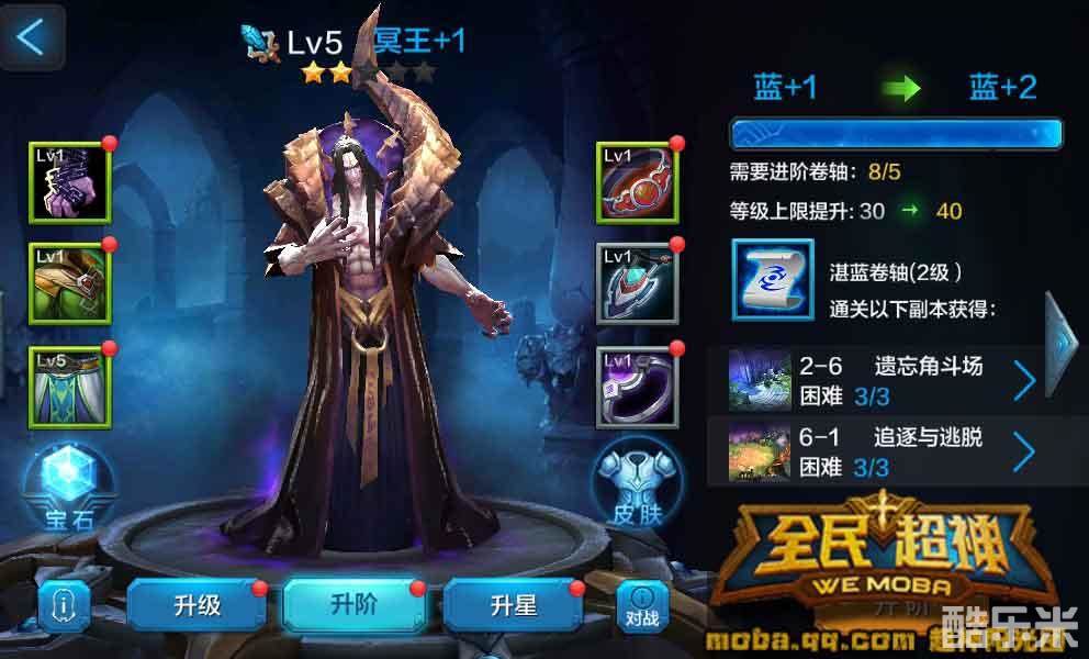 冥王哈迪斯进阶需要卷轴,由于冥王哈迪斯属于法师,就需要不同等级的湛蓝卷轴。升阶卷轴可以通过刷困难闯关关卡随机获得,或者金币抽奖随机获得,只要努力,升阶到紫色会很快的。