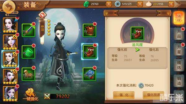 游戏中每个武将拥有6件装备,这6件装备都可以随着武将等级的提升而进行强化,从而使英雄获得更加强力的装备效果,比如最大生命的加成、攻击或防御的加成。