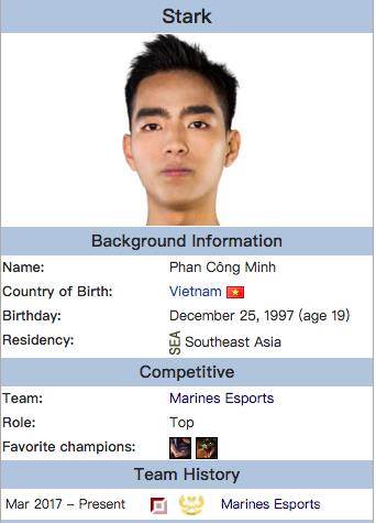 据了解,Stark出生于1997年12月,今年19岁。今年三月份加入Gigabyte Marines担任上单,擅长英雄是兰博和鳄鱼。在打职业之前,他曾是越南服务器的高分路人,曾打上越南服第一的位置。