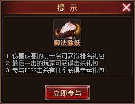1、在御法除妖活动界面可看到已刷新的活动BOSS,点击BOSS下的筋斗云即可传送至BOSS场景。参与击杀BOSS可获取丰厚奖励,奖励将会以邮件的形式发放。