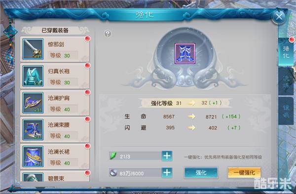 装备强化需要消耗银币以及对应的强化材料(已知:1-49级使用绿玄石,50-69级使用蓝玄石,70-89级使用紫玄石),装备强化会增强装备基础属性,提高角色战力。强化等级越高,消耗的资源会越来越多,同时也会激活额外加成属性,大幅提升装备战力。需要注意的是,强化最大等级不能超过角色等级哦~