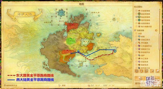 第一条路径是从西大陆的双冠丘陵伊兹那上方我做货点或者住宅区制作特产运往东大陆的咏唱之地。这条路径可以说是由西到东最为快捷和安全的路径了。因为双冠丘陵不止是安全地图,而且几乎可以直接下海,直线运货到达咏唱之地。可惜的是快捷必将意味着收入的减少。这条路径每个特产的收入为8个稳定的石盐碎片。