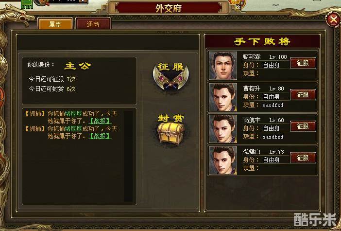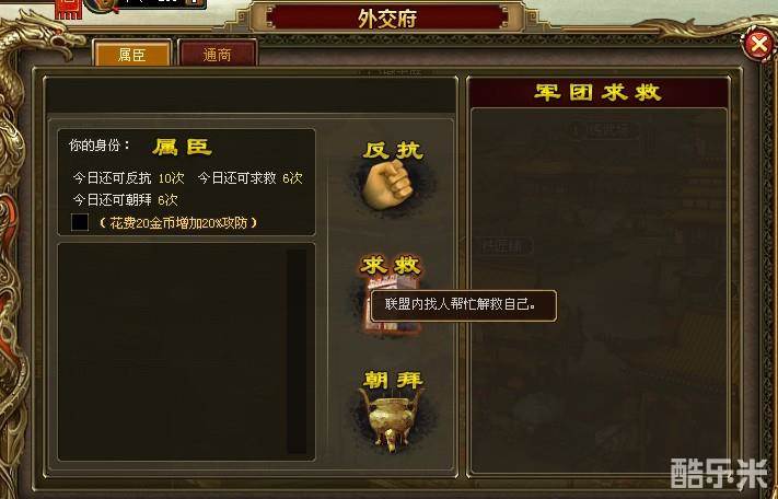 若是不幸被人抓做属臣,若是实力差距不大,可以进行强力反抗,若是实力差距太大则可以向联盟内的大哥们求救。不过求救之前可以先朝拜完,朝拜可是会获得银币奖励的。