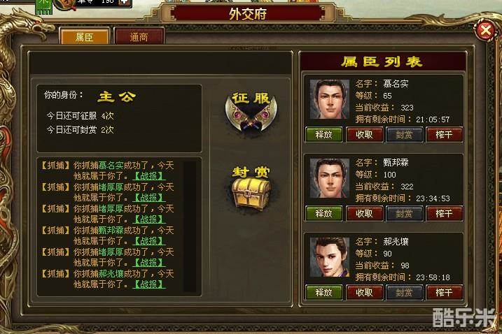 帝王传中,外交系统是一个很不错的系统。玩家们可以在外交府能进行属臣的抓捕、与其他玩家的通商、攻打敌国以及跑商。这些活动能为玩家提供很多银币。下面小编就来详细的介绍下外交系统。