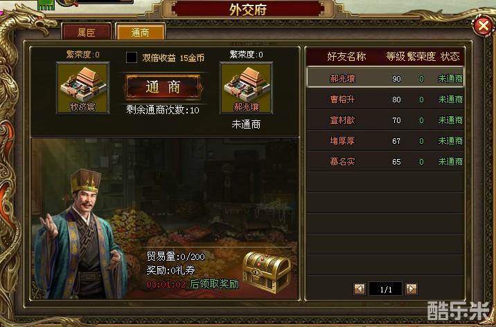 玩家每天拥有10次的免费通商机会,玩家与好友通商能获得大量的银币奖励。玩家若是与联盟内的好友通商的话,不仅通商收益会因为联盟科技有所加成,而且还有机会获得联盟贡献提升联盟科技等级。每天有好友向你通商会增加你的贸易量,根据贸易量每天有一次领取礼券的机会。