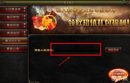 兑换方式:进入游戏后,点击“登录福利”图标,选择激活码礼包,输入礼包激活码点击领取。