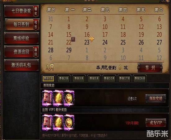 除了开服前7天外,每天登录游戏进行签到还能领取大量的绑定元宝、商城道具,签到时间越长奖励越丰厚。
