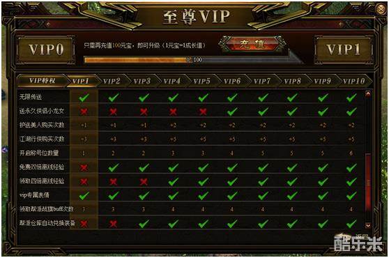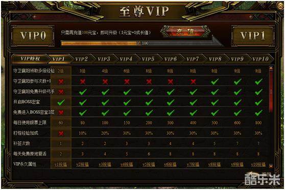 累计充值达到100元宝,即可成VIP,拥有诸多特权。
