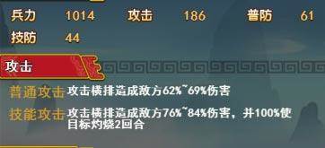 技能对横排造成敌方76%~84%伤害,并100%使得目标灼烧2回合。