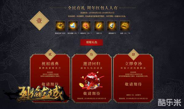 本次《烈焰龙城》两周年盛典,除了全新版本3V3角斗场、灭世神装、超级BOSS等内容体验外,专题之中还有着大量的福利活动,等待勇士们前来参与!本次专题结合全民有礼、弹幕、签到、祝福票选、微信H5小游戏、老玩家回归、微信微博社群活动等八大活动,每一项活动,都有机会获得超豪华礼包,更有红木屠龙刀雕饰、龙城定制笔记本、优酷黄金会员月卡等豪礼矩阵等待你来拿!更有游戏中的周年活动将于5月9日开启哟!