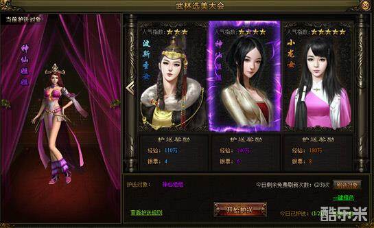 武林选美“中的各色美人包括珠儿、赤练仙子,波斯圣女,神仙姐姐和小龙女。品质送白一直到橙色,相比不用介绍就知道小龙女就是橙色5星,每天有3次免费刷新机会,可不一定能刷到蓝色以上哦~然而一键橙色仅需20元宝。小龙女的经验可是珠儿的4倍多哦!颜值果然重要,此元宝必花!