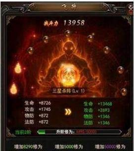 刚开始的飞升是让玩家开启三星杀阵,提供的战斗力是非常的低的,只有1W左右。玩家可以通过增加修为,让三星杀阵的等级提升,提供的战斗力也会越来越多。三星杀阵能从各个属性增强玩家。