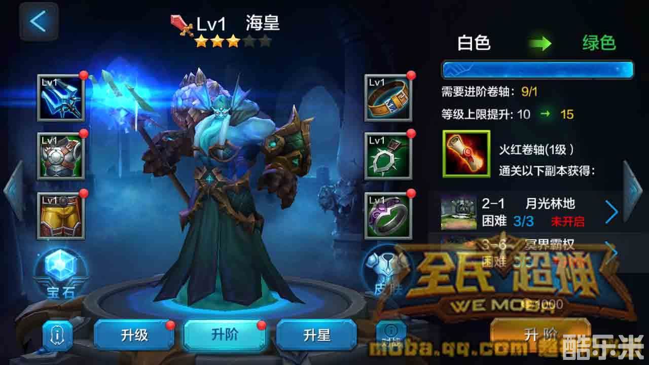 海皇进阶需要卷轴,由于海皇属于战士,就需要不同等级的火红卷轴。升阶卷轴可以通过刷困难闯关关卡随机获得,或者金币抽奖随机获得,只要小伙伴们自己努力,升阶到紫色会很快哦。