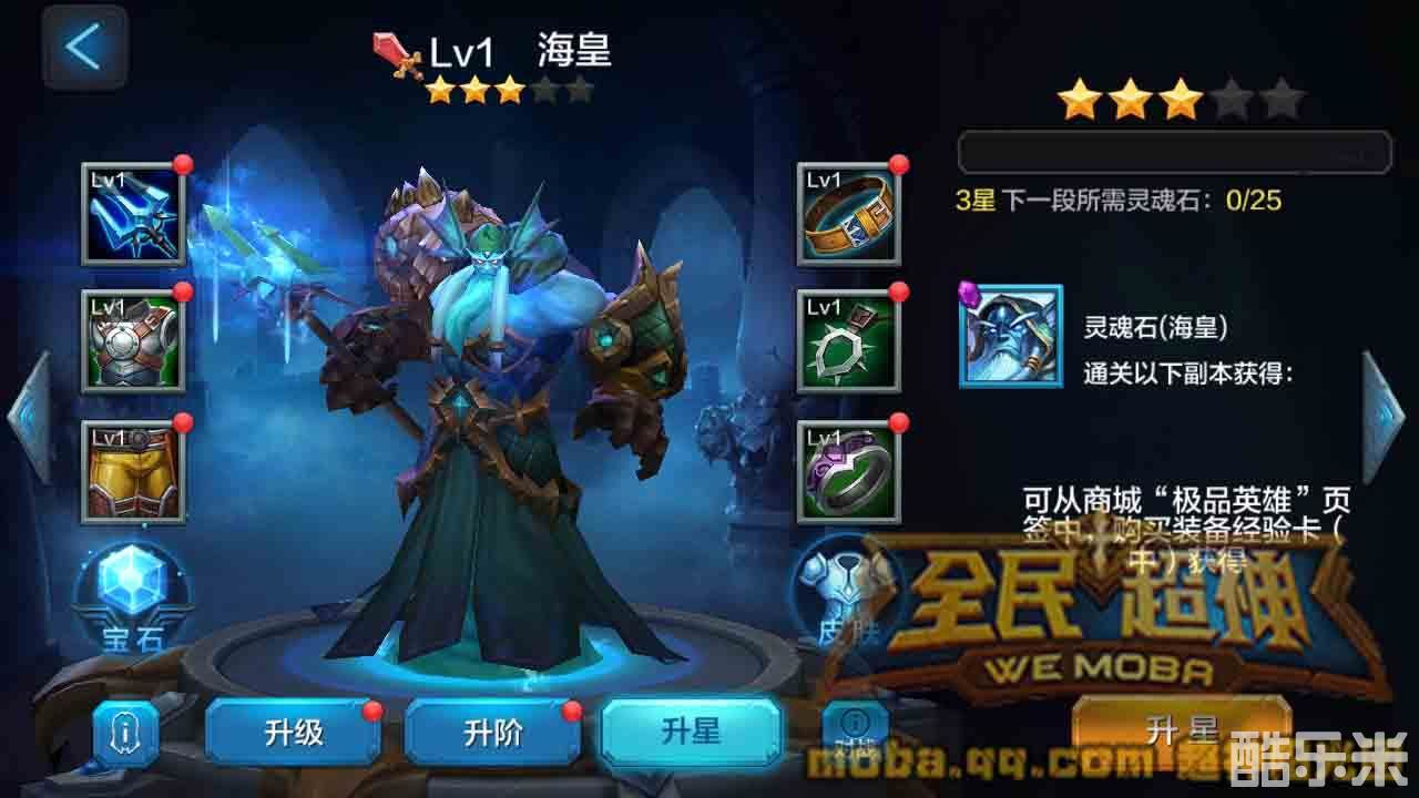 英雄升星需要该英雄的灵魂石,海皇初始为三星, 3升4需要25,4到5需要50,而每个星等之间升级需要5次,所以培养一个英雄并非一朝一夕的事,大家加油哦!