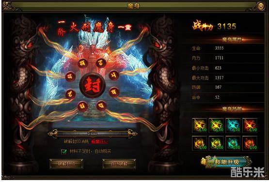 2.魔身技能:共有8个技能,每个技能最高5级,分别使用九幽魔金、血狱魔金进行技能升级。提升技能可加四个相性的攻击、防御(金、木、水、火)哦(PS:魔身技能不可大于进阶等级。)
