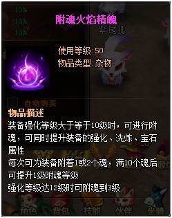 当玩家的装备强化等级大于或等于10级时,就能开启装备附魂系统,此时玩家可以对装备进行附魂操作,通过装备附魂能够同时提升装备的强化、洗炼和宝石属性,每次都可为装备附着上1或2个魂魄,在满足10个魂魄后就能够提升1级附魂等级,在强化等级达到12级时就可附魂到3级。