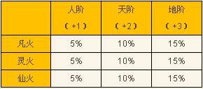 而装备附魂的操作很简单,不管是凡火,灵火,仙火还是神火,只需要“附魂火焰精魄”即可,“附魂火焰精魄”能够在商城中购买,值得一提的是,装备附魂按照百分比提升来强化属性,当玩家的当前强化属性,宝石属性,洗炼属性越高,装备附魂可提升的战力就越高。装备附魂的提升百分比如下图所示。