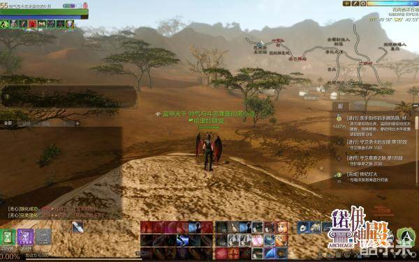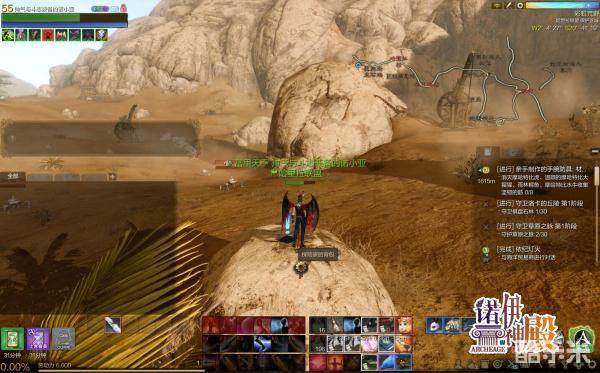 来到哈里兰新手村,由于这里地势比较高,放眼望去视野非常开阔,整个彩虹荒野西部都尽收眼底。我个人非常喜欢彩虹荒野的地貌颜色,土黄的大地,石灰白的岩石,翠绿的植被,这一切看上去都是那么舒服又自然。视野右前方有一块岩石,跳上去可以得到哈里兰种族来到这个世界的第一个探险成就:龙之路的起点,登上某个小小的岩石。