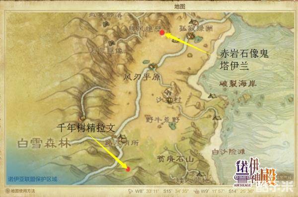 碎石平原共有2个赏金BOSS,一个是千年树精拉文,另一个是赤岩石像鬼塔伊兰,他们的位置分别如上图所示。对于哈里拉大陆的玩家,想要来到这个地图可以传送至副本“风刃废矿”。此地图上诺伊大陆的卫兵分布比较少,只需注意敌对玩家即可,相对其他几个地图来说还是很安全的。