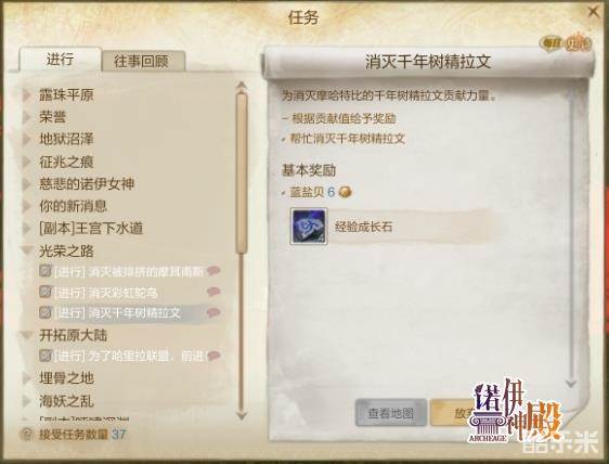 选中这个BOSS,鼠标动到它的血条上可以显示出它的名字“千年树精拉文”,等级30,血量140205。攻击它后会获得任务“消灭摩哈特比的千年树精拉文”。实在不知道为什么摩哈特比的这个树精会跑到这一块大陆来,难道是穿越了?不过经过测试在莫哈特比接到任务后击杀这里的拉文也能完成任务,同理在这里接到任务后,去摩哈特比也能完成。