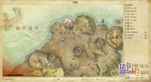 我们最后要来到的地图是诺伊大陆的一个重要港口地图“十字星平原”,在这里有着全游戏唯一一个在中立地图的赏金BOSS“焦岩石像鬼德拉犹达”,具体位置如图所示(地图“熔岩平原”的“熔”字下方不远处)。
