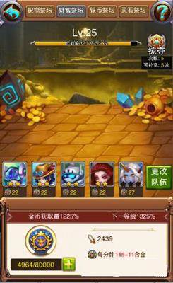 游戏中祭坛一共分为四种,分别是:祝福祭坛,提高祝福对圣物攻击力加成效果;财富祭坛,能够增加在战斗中获得的金币数量;银币祭坛,可以增加在战斗中获得的银币数量;灵石祭坛,可以提高勇者之心效果。