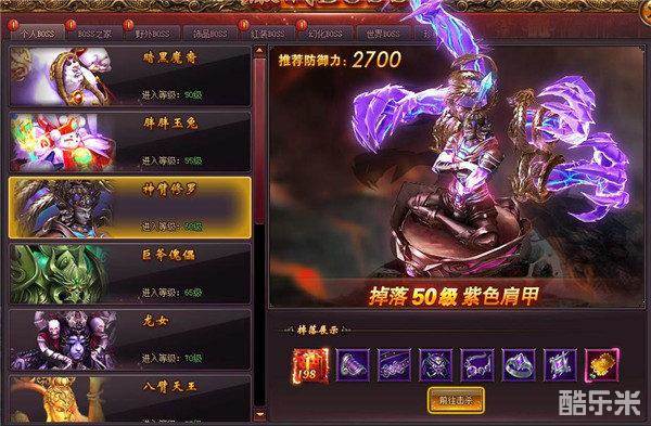 60级个人BOSS神臂修罗:掉落50级装备灼星套装、运镖令、198买断礼包