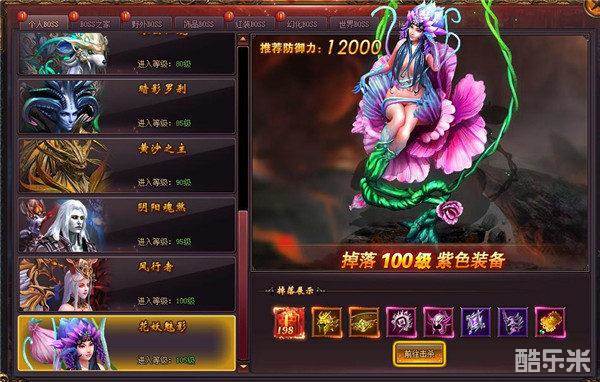 105级个人BOSS花妖魅影:掉落100级装备圣君套装和龙图套装、伏魔套装、运镖令、198买断礼包