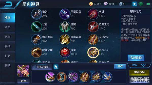 暴击装通常是以无尽战刃与宗师之力为主的输出装,再根据情况搭配其他合理的出装来增加雅典娜的输出。战士装则是以暗影战斧加防御装为主的出装,目的是使雅典娜具备攻击力的同时也具备一定的坦度。
