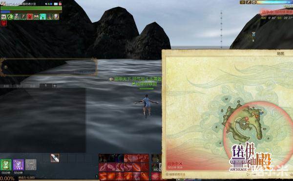 在地图上看起来整个咆哮岛呈现出贝壳状的外形,围绕着岛的海水都非常清澈,轻易就能看到海底的情况。当我们游到咆哮岛右侧另一个小岛的时候发现这里的海水颜色比周围要黑不少,下面应该挺深的。翻身进海里一探究竟吧,万一发现个藏着宝藏的洞穴不就发达啦!