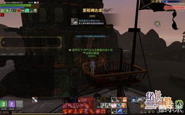 就从我们所在的山坡上起跳,打开滑翔翼先用跃起技能把高度提起来,然后打开加速技能尽快飞到瞭望台上空,这时候非常容易遇到海风的影响,滑翔翼会被扰乱,所以早点过去早点安心,在中间耽搁的时间越长越容易被海风打落高度。到达瞭望台上空就可以收起滑翔翼了,降落到瞭望台上我们还可以达成一个成就“我是要成为海盗王的!登上摩耳甫斯海盗船的瞭望台”。