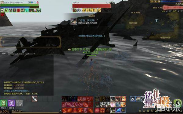 绕着小岛环游一周,我们可以发现不少的礁石,还有一块旧船骸一半浸入水中,一半露在外面。这个船骸有什么故事呢?我们游到船骸附近的时候就会完成一个探险成就:“你跳,我就跳!”发现铁达尼克号的船骸。好吧,原来这块破烂的船骸还是大有故事的,铁达尼克号,大家猜这是不是上古世纪中的泰坦尼克?露丝和杰克的魂魄指不定也在附近看着我们。好吧,说这个有点慎得慌,我们还是上岛去看看吧。
