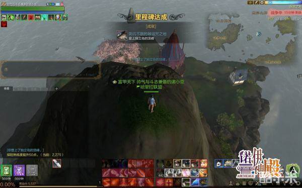 南侧这边的山坡到了一段不容易蹦上去的阶段,背面的话情况也好不到哪里去,如果我们想打开滑翔翼飞到背面去会很困难,这个岛上的海风和湍流还是挺凶的。这时候大家可以观察一下,山巅的部分其实并没有太陡,我们可以稍微侧着一点,使用滑翔翼向着左侧的山壁起飞,然后在中途的时候打开滑翔翼的跃起技能,这时候滑翔翼是可以顺着山的走势直接滑到山顶上面的。到达山顶的瞬间收起滑翔翼就可以稳稳的落到山顶了。在这里我们可以达成探险成就:阴云不散的被诅咒之地,登上独立岛的顶峰。这时候我们也就明白了为什么岛周围总是笼罩着一层薄雾,并且知道了这个小岛的名字叫做独立岛。