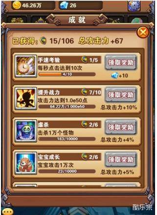 成就系统,只要达到了一定的成就,就可以领 取该奖励。成就系统中,主要是考验玩家的手速、宝宝杀怪、升级圣物等。可以毫不客气的说,这里遍地都是机遇,说不定不经意的一个小举动,便会让你收获一份丰厚的成就奖励。