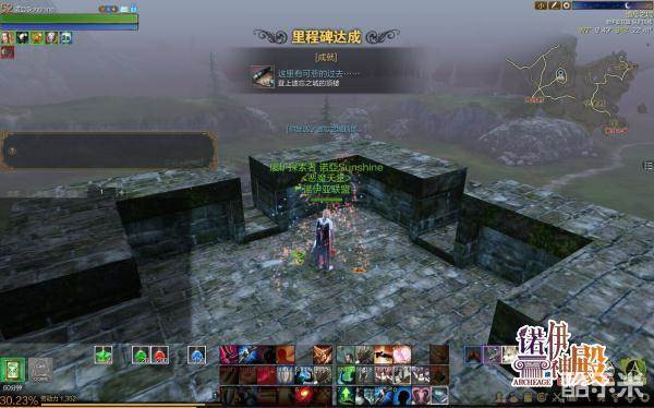 看到城内最高的塔楼了吗?我们的第一站就是那里,找一个海拔高一点的山坡就可以比较轻松的飞过去了。记得要在半空中的时候把滑翔翼跃起的技能使用了,在起飞伊始就要把加速技能点开,因为滑翔翼不会一直在同一高度滑行,而是高度越来越低,使用滑翔翼技能可以帮助我们更快更稳的到达塔楼上。稳稳落下来之后就可以完成在塔楼顶上的里程碑了:这里有可悲的过去……登上了遗忘之城的顶楼。