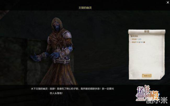 自己给自己打打气,在这种等级的地图应该不会出现太过BUG的BOSS吧?我们F键打开石棺就会出现对话,原来是一个水下王陵的灵魂,还是一个任务,我们将任务接取之后就会进入战斗了。水下亡灵会召唤出两个亡灵生物,伤害不是太高,血量倒是不少,幸好怪物并没有什么太过棘手的技能,还是比较容易击杀的。