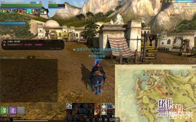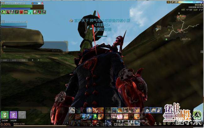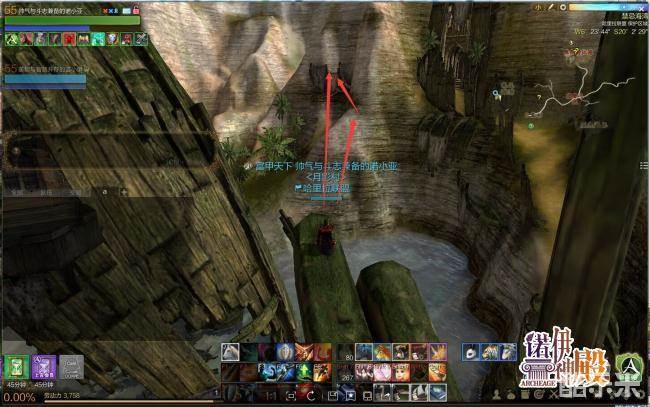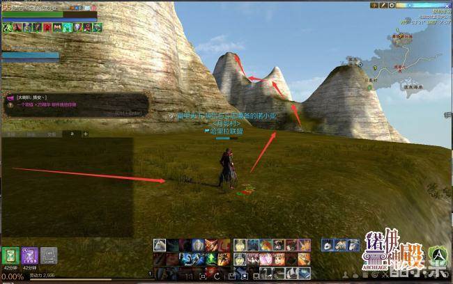 绕到巨大山体的背后,我们就可以发现一条比较缓和的上山通道了。沿着箭头的指示方向,左侧的山体并不容易攀登,所以我们选择右侧那座山峰来作为起飞的跳板。先骑着坐骑一路蹦蹦哒哒过去到驼峰处,再往上的时候要小心了,使用滑翔翼的时候一定要控制好方向和高度,因为驼峰的左右两侧都是悬崖峭壁,掉下去直接摔死(我登的时候真真的因为没控制好滑翔翼方向,总是过于偏左或者偏右摔的鼻青脸肿- -)!所以再登顶之前一定要注意,每一次的跃起只要碰到山壁就会直接摔下去的。