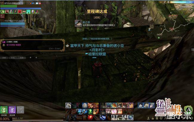 站在山坡上俯视整个禁忌海湾,无数或大或小的沉船残骸映入眼帘,最醒目的自然是中间高大的桅杆,据我所知,这个桅杆顶部是有一个成就存在的,不过直接上去并不容易。这时候我们可以看到右侧的山峰,如果我们可以爬到右侧的几个山峰顶上,只要高度足够的话,应该是有机会飞到桅杆顶部的,说干就干,我们先穿过兽人部落,绕到山后面去找找上山的路。