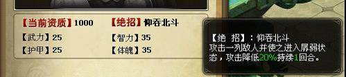 首先我们来讲甘露露,当我看到甘露露这个名字的时候,首先联想到的居然是干露露,不知道大家是否和我有一样的想法(有点邪恶,哈哈)?那么我们就来看看干露露这个将领。首先是她的四维(武力、智力、护甲、体魄)非常之低,我们再来看看她的绝招,仰吞北斗:攻击一列并使之攻击降低20%,这个技能在前期对战的时候还是比较有作用的,因为前期玩家的攻击力都很低,那么你降低敌方这一列的敌人20%攻击,对于这场比赛的胜利还是有一定帮助的,所以推荐指数:3颗星。