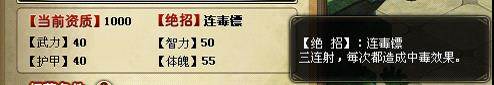 接下来我们来看看庞德。庞德,西凉时期马腾帐下一员大将,其十分骁勇善战。我们来看看这里他的情况。他的四维也是很低,但这都是由于品阶低的原因,所以并无大碍,那么他的绝招是连毒镖:三连射,每次造成中毒效果,大家都知道中毒的效果是可以叠加的,最多可以叠加5层,没回合掉一定百分比的血量,所以这个技能还比较不错,但是实际的实战中,这个技能的输出很低,主要是起到一个中毒的效果,所以推荐指数:3颗星。