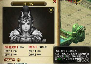 我们接下来谈论一个神级将领:马云禄,马云禄是三国中一个虚构的人物,虚伪成马腾之女,马超之妹,赵云之妻。那么我们来谈谈为什么马云禄绝对是神级将领的原因。首先声明,马云禄是大R的拥有品,因为召唤马云禄的条件是300个绿魂,250个蓝魂和100个紫魂。蓝魂和绿魂相对好弄,但是紫魂就需要大量元宝才能得到。所以没有一定经济基础的玩家是招不起的,那么我们再来看看马云禄的四维,他的四维属性非常高,已经达到了一个超级将领的基本条件,那么我们再来看看马云禄的绝招,一骑当先,攻击一列敌人,如果目标是女性,则被沉默一回合,同时恢复全体友军150点士气,出手速度极快。那么很多玩家就会问,这个出手速度极快是什么意思,我可以很严肃的告诉大家,马云禄的出手速度天生比其他任何将领快50点,这就证明了只要青龙魂和鞋子相同,那么马云禄绝对是最先出手的,我之前在策士篇讲过,小乔是现在策士里最好用的将领,但是有且只有一个将领能克制他,那就是马云禄。因为马云禄比小乔先出手,那么他就会率先用技能让全体友军恢复150点士气,而全体友军的士气也随之上升到650,大家都知道。出绝技需要500点士气,那么马云禄让全体友军的士气变成650,如果马云禄和小乔同在一列还能造成小乔沉默出不来绝招,就算不在同一列,小乔让对方全体士气少150点后,也还是500点,所以说,马云禄是大家在出诸葛亮之前最好的将领,没有之一。推荐指数:5颗星。