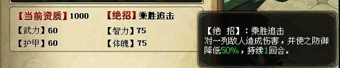 我们接下来谈谈张郃。张郃,曹操部下“五子良将”之一,其实力不容小觑。我们来看看他的情况。他的四维一般,但是他的绝招挺不错,乘胜追击:攻击一列敌人,并使之防御降低50%,持续一回合。张郃降低一列敌人50%防御的效果非常好用,实际PK中,张郃降低一列敌人50%防御后,大大的增加了友军策士全秒敌人的能力。所以推荐指数:4颗星。